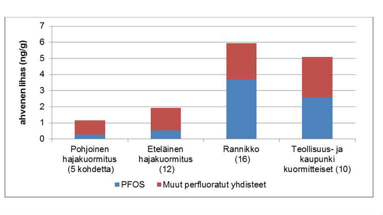 Perfluoratut yhdisteet ahvenessa Suomen vesistöissä. Ainoastaan PFOS käyttöä on kansainvälisesti rajoitettu. Perfluorattuja yhdisteitä käytetään yleisesti parantamaan tekstiilien vedenpitävyyttä ja estämään likaantumista, sammutusvaahdoissa ja metallien pintakäsittelyssä.