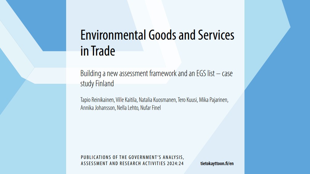 Suomen ympäristökeskuksen (SYKE) ja Elinkeinoelämän Tutkimuslaitoksen (ETLA) toteuttamassa valtioneuvoston selvitys- ja tutkimustoiminnan (VN TEAS) hankkeessa tarkasteltiin olemassa olevia, kansainvälisissä järjestöissä tehtyjä ympäristötuotteiden ja -palveluiden (Environmental Goods and Services, EGS) listauksia sekä tutkittiin suomalaisten yritysten kilpailukykyä alan kansainvälisessä kaupassa.