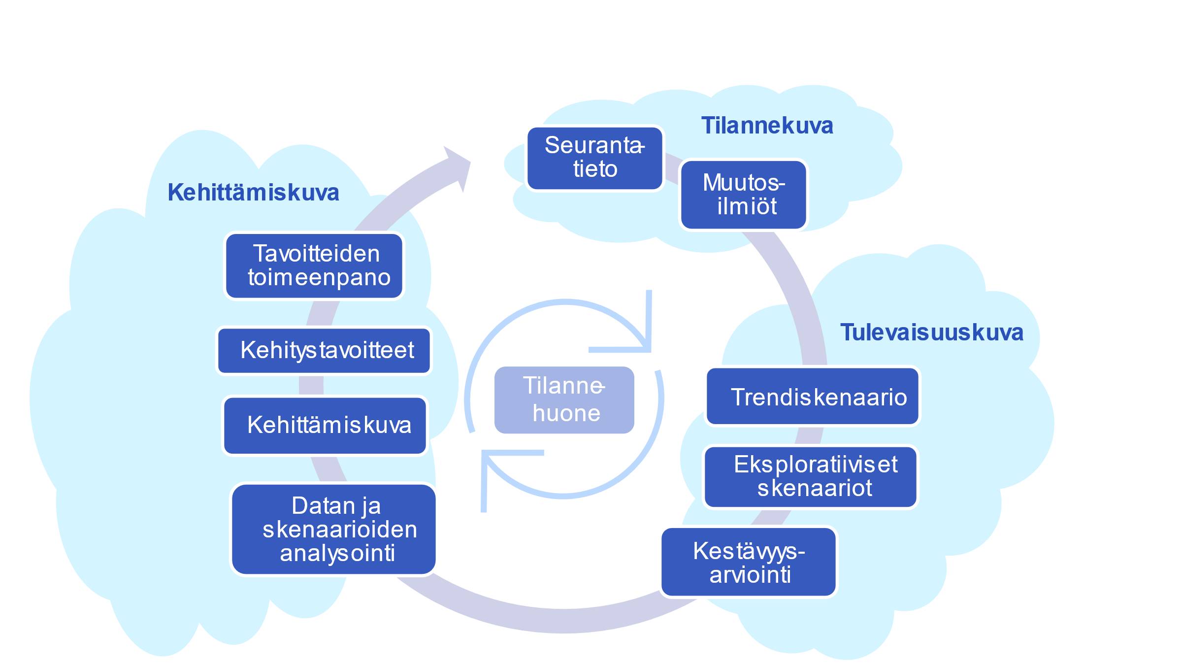 Toimintamallin keskiössä on kolmivaiheinen syklinen prosessi (kuva 1.), joka luo raamit jatkuvalla ennakointityölle. Ensin laaditaan tilannekuva, johon kuuluu alue- ja yhdyskuntarakenteen kehityksen jatkuvaan seurantaan pohjautuva katsaus tämän hetken kehityksen tilaan sekä kehitykseen vaikuttavien muutosilmiöiden kartoittaminen. Seuraavaksi muodostetaan tulevaisuuskuva, johon kuuluu trendiskenaarion ja tälle vaihtoehtoisten eksploratiivisten skenaarioiden luominen sekä näiden kestävyysarviointi. Viimeisessä vaiheessa määritellään normatiivinen skenaario eli kehittämiskuva sekä sitä kohti vievät kehitystavoitteet ja -toimenpiteet. Yhden syklin kesto on neljä vuotta, minkä jälkeen prosessi aloitetaan uudestaan, edellisten syklien tuloksia pohjana käyttäen.