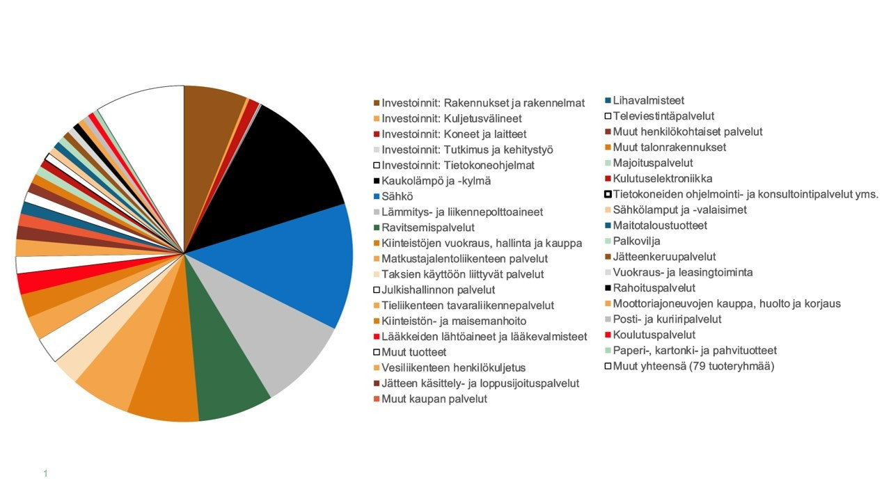 Kuva: Investointien ja hankittujen tavara- ja palveluryhmien osuudet sosiaalisektorin hiilijalanjäljestä. Alustavia tuloksia EKO-SOTE-hankkeesta. Data: Hannu Savolainen, SYKE.
