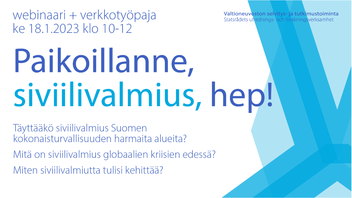 Paikoillanne, siviilivalmius, hep! -webinaarissa kuullaan asiantuntijapuheenvuoroja siviilivalmiudesta sekä käydään keskustelua tulevaisuuden tarpeista Suomen siviilivalmiudelle.