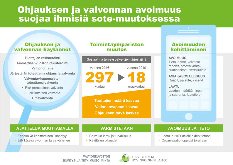 Hankkeen päätavoitteena oli selvittää, miten viranomaisvalvontaa tulee sote-uudistuksen yhteydessä suunnata tuottavuuden ja vaikuttavuuden kannalta optimaalisella tavalla ja miten omavalvonnan vaikuttavuutta voidaan vahvistaa osana valvontakokonaisuuden uudistamista.