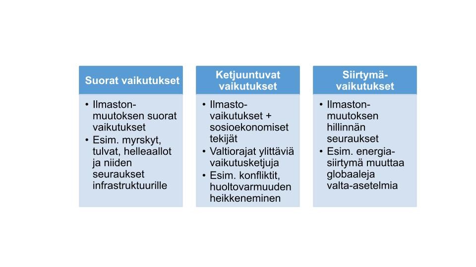 Hankkeemme lähtökohtana on ollut, että ilmastoturvallisuuden jäsennyksen tulisi olla sekä käyttökelpoinen että viimeisintä tutkimusta heijasteleva. Turvallisuusvaikutusten moninaisuudesta huolimatta jäsennyksen tulee olla riittävän yksinkertainen, jotta se edistäisi käytännön politiikkatyötä. Toisaalta lähes miten tahansa jaoteltuina vaikutuksilla on keskinäisvaikutuksia, joten eri kategorioiden välillä on väistämättä päällekkäisyyksiä. Lopulta päädyimme kolmitasoiseen jäsennykseen, jossa ilmastoturvallisuus on jaettu suoriin, ketjuuntuviin ja siirtymävaikutuksiin.
